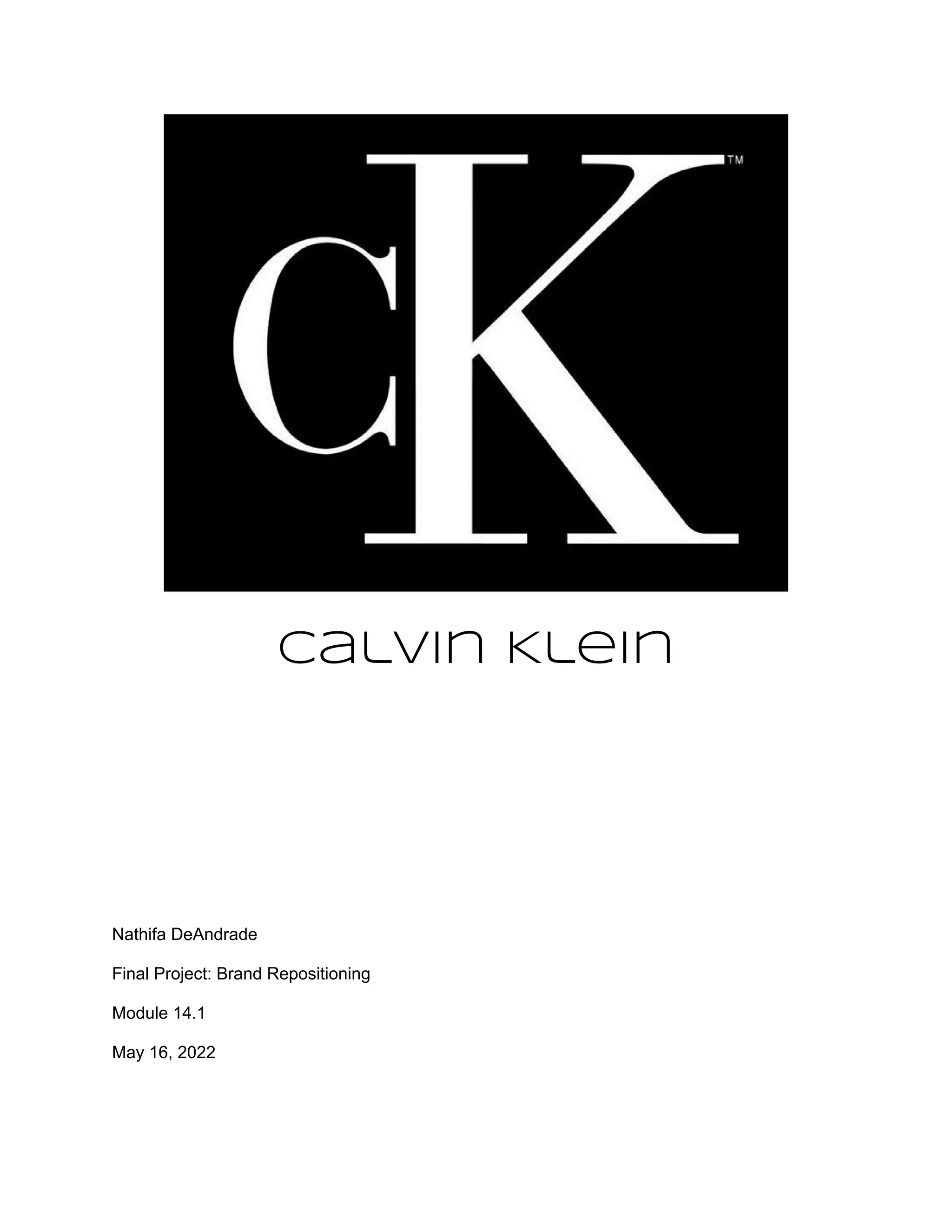 This document provides an overview and analysis of repositioning the Calvin Klein brand to target younger consumers aged 20-30. It discusses conducting a competitive analysis of Calvin Klein and similar brands, using influencer marketing and interactive media, sales promotions, visual merchandising, and public relations strategies. The document proposes keeping Calvin Klein's minimalist aesthetic while making designs more edgy and urban. It also suggests continuing to use celebrities and influencers in marketing, especially those popular with younger demographics. The goal is to make Calvin Klein feel fresh and relevant to younger consumers without changing its core identity.