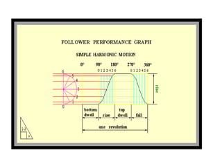 1) The document discusses cam and follower mechanisms including definitions, classifications, and terminology.