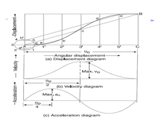 The document provides an in-depth analysis of the kinematics of cam mechanisms, detailing the definitions, classifications, and applications of cams and followers in mechanical systems. It explores the evolution of cam designs, the basic principles of cam movement, types of cam profiles, and the kinematic terminology used in cam and follower motion. Additionally, it includes examples of cam applications, particularly in engine components, and outlines the mathematical relationships governing follower motion and acceleration.