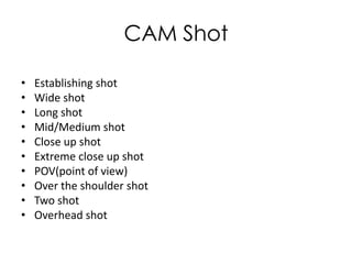 This document discusses various camera shots, angles, movements, and composition techniques used in filmmaking. It provides examples to illustrate each technique, such as establishing shots that set the scene, close-ups that show details, and symmetrical framing that creates balance. Camera movements like pans, tilts, tracks and zooms are defined, as well are compositional elements like using the rule of thirds. Through a series of examples, the document aims to explain fundamental visual storytelling tools for photographers and filmmakers.