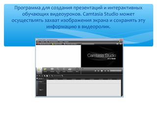 Camtasia Studio 7.1 - это программа для создания презентаций и обучения с функцией захвата экрана и видеозаписи. Пользователь может записывать слайды презентации, управлять настройками записи и выполнять монтаж видео, включая добавление звука и изображений. Завершающий этап включает сохранение готового продукта с помощью функции 'produce and share'.