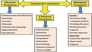 The document discusses the treatment of various types of waste including sewage water, industrial waste, and agricultural waste. Sewage water undergoes primary, secondary, and tertiary treatments including screening, sedimentation, aeration, and disinfection. Industrial waste treatment focuses on removing solids, oils and greases, biodegradable organics using activated sludge or trickling filter processes, and other organics, acids, and alkalis. Agricultural waste treatment addresses non-point pollution from surface runoff and point sources from large livestock operations, using methods like constructed wetlands, anaerobic lagoons, and composting of animal slurries. Oil spill cleanup and recovery uses bioremediation, controlled burning
