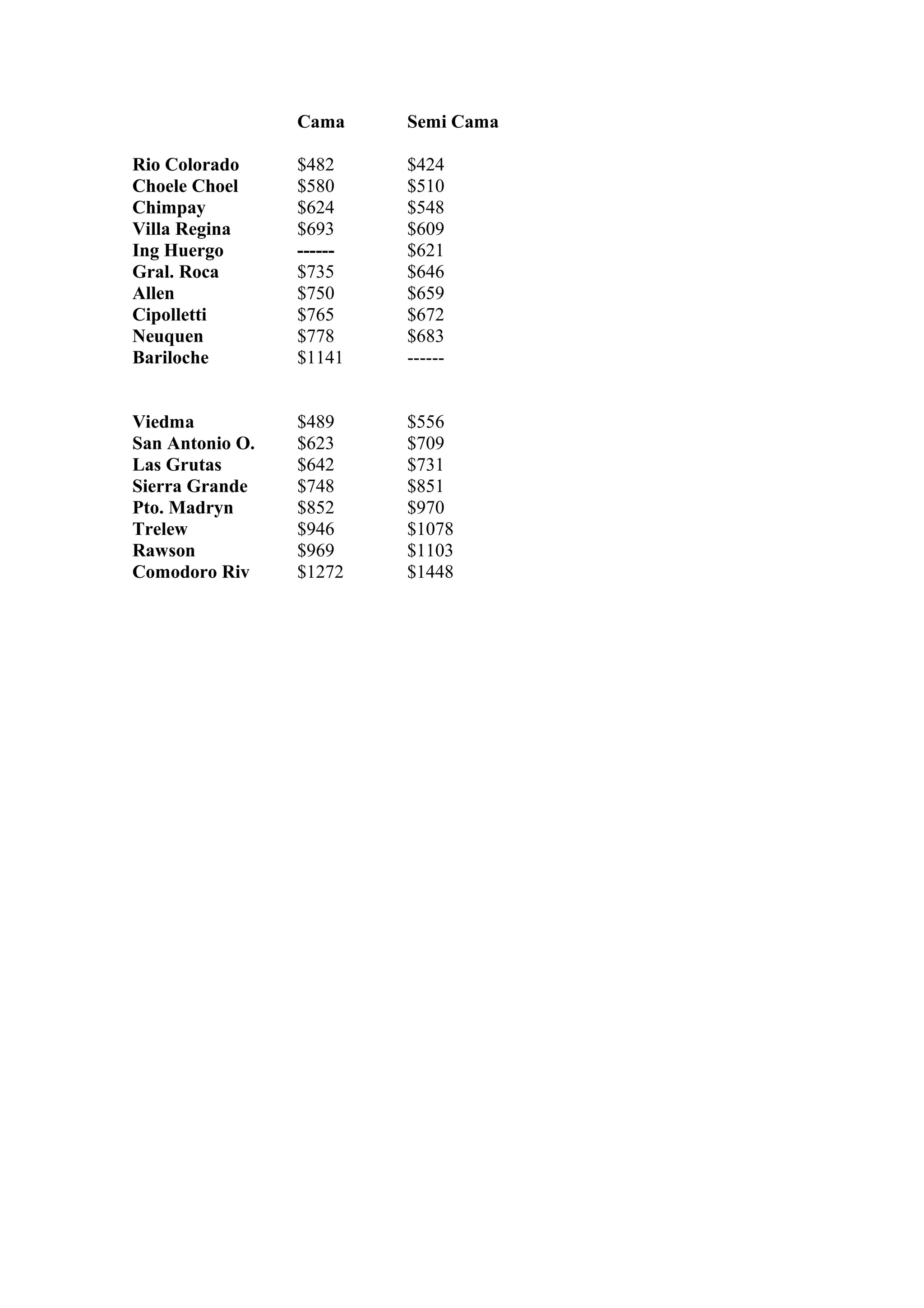 The document lists city names and two price ranges in Argentine pesos for each city. The first column lists prices from $482 to $1272 while the second column lists slightly lower prices ranging from $424 to $1448. Most cities have two prices listed but some only have one price listed. The document appears to be a listing of city names and potential price ranges for travel or accommodation in those cities in Argentina.