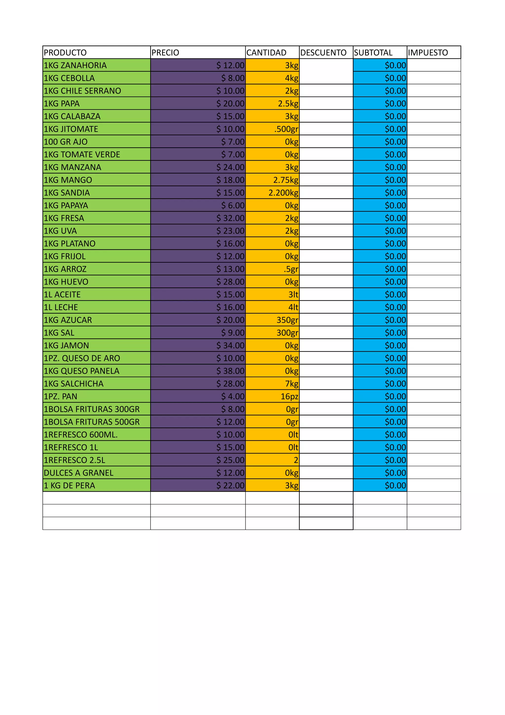 The document lists various grocery products including vegetables, fruits, meats, dairy, and other items. It provides the price per kilogram or unit for each product. The list also includes the quantity purchased of each item, any discounts applied, subtotals, and taxes. In total, the document provides a receipt for various grocery items purchased.