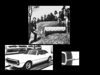 The document summarizes the history and pop culture presence of the Chevrolet Camaro, as well as threats from laws and regulations. It mentions that the Camaro has been featured in over 100 movies and television shows. It also refers to the legendary Chevy small block 350 engine and issues surrounding emissions standards and vehicle scrappage that threaten the Camaro.