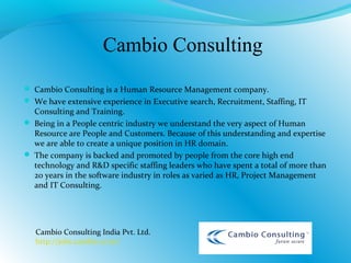 Cambio Consulting is an Indian HR management and consulting firm with over 15 years of experience in executive search, recruitment, staffing, and training. They have offices in Bangalore and Hyderabad and specialize in IT and general staffing. Their services include executive search, permanent recruitment, contract staffing, and contract-to-hire. They aim to become the top player in the IT domain and expand into other industries through their expertise in recruitment and understanding of both client and candidate needs.