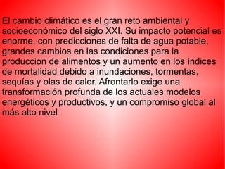 El cambio climático representa el mayor desafío ambiental y socioeconómico del siglo XXI, con predicciones de escasez de agua, cambios en la producción de alimentos y un aumento de la mortalidad por eventos climáticos extremos. Afrontarlo requiere una profunda transformación de los modelos energéticos y productivos a nivel global con un fuerte compromiso de cooperación internacional.