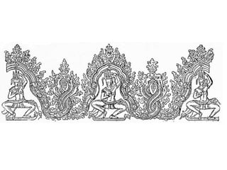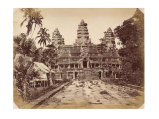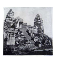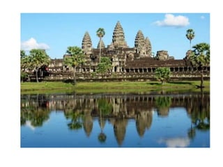 The document summarizes the history of architecture in Cambodia, beginning with the pre-Angkor period when the Funan kingdom was established in the 3rd century. It then discusses the Chenla period in the 5th century before focusing on the iconic Angkor period. It provides details on the renowned Angkor Wat temple complex, describing it as the "mother of all temples" and noting its immense size, with galleries, courtyards, and a central tower surrounded by a large moat. Numerous other Angkor period temples are also mentioned.