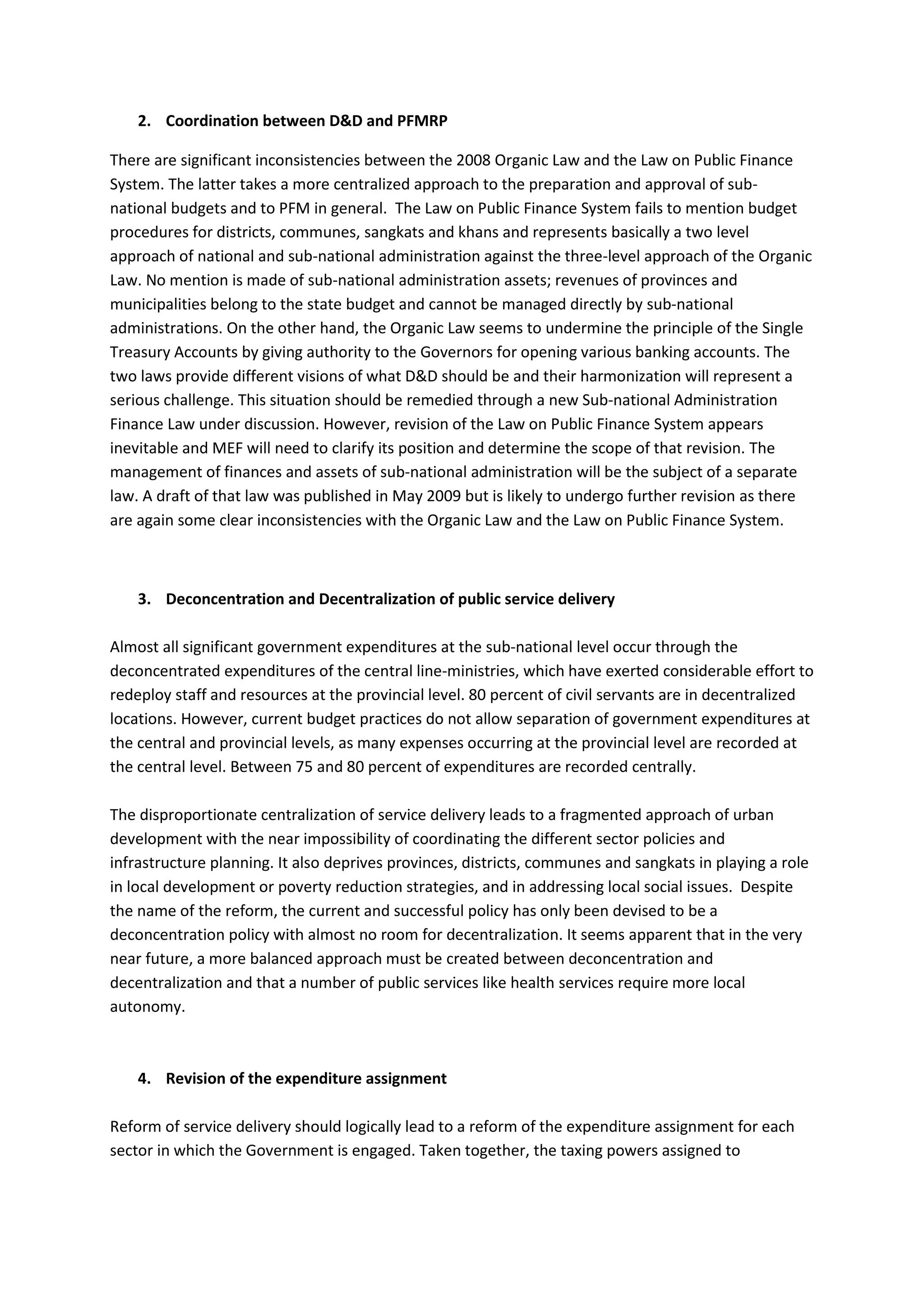 The document summarizes the progress and issues regarding decentralization and deconcentration reforms in Cambodia. It discusses several key points: 1) The reforms aim to redefine powers and responsibilities at the provincial, district, and municipal levels but have focused more on deconcentration than fiscal decentralization. 2) There are inconsistencies between laws governing sub-national administration and public finance that need to be resolved. 3) While expenditures are decentralized, budgeting remains centralized, and the reforms have focused more on deconcentration than decentralization of service delivery. Revising expenditure and revenue assignments according to responsibility transfers is still needed.
