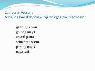 Dokumen ini membahas beberapa jenis tembung dalam puisi Jawa, yaitu Camboran Wutuh yang menggabungkan dua baris menjadi satu dengan makna baru, Camboran Wudhar/Tugel yang berisi baris-baris bermakna serupa, Tembung Entar yang terdiri dari baris-baris tidak bermakna sama, Tembung Saroja yang terdiri dari dua baris atau lebih yang bermakna sama yang digabungkan, dan Tembung Garba yang menggabung