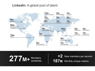 The document discusses scaling recruiting efforts on LinkedIn. It notes that LinkedIn has over 277 million members worldwide from countries around the globe. It then discusses targeting both active and passive candidates, measuring a company's talent brand, and comparing it to peers. The document proposes a strategy using LinkedIn Jobs, Sponsored Jobs, LinkedIn Recruiter, and developing a company's talent brand profile to engage more passive candidates. It provides an example of how one company, Cambrex, can expand its outreach on LinkedIn, target specific roles through Sponsored Jobs, and see pricing details for those products.