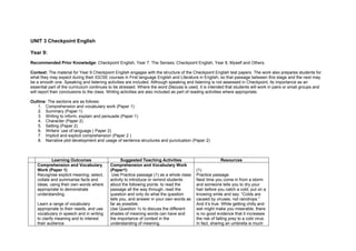3. It provides learning outcomes, teaching activities, and resources for each section, including comprehension exercises, writing prompts, and guidance on summaries, paragraphs, and persuasive writing.