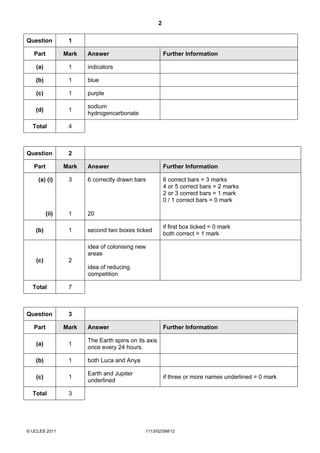 This document consists of a specimen mark scheme for a science exam consisting of 10 questions testing various concepts. It provides the answers and level of marks awarded for each part of each question. The mark scheme offers further information for some answers to help examiners determine partial credit. It serves to evaluate student responses on the exam in a standardized and objective manner.