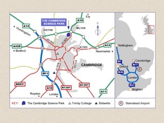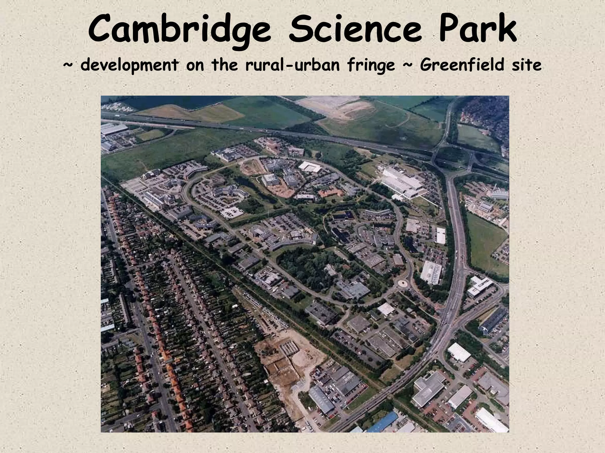 Cambridge Science Park was established in 1972 on a 50 hectare greenfield site by Trinity College, Cambridge University. It is located on the rural-urban fringe and has over 65 tenants employing more than 2,000 people in scientific and research developments. The park has landscaped trees and lakes and is accessible by major roads and railway while providing amenities for employees like a health club, nursery, and restaurants.