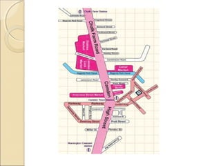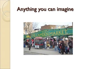 Camden Market in London covers six sections and is known as a cultural melting pot where visitors can find unique souvenirs, vintage clothing, and a variety of exotic foods. The market is divided into different areas including Camden Lock Village, Camden Lock Market, Camden Buck Street Market, Camden Market Hall, Camden Stables Market, and Inverness Street Market. Chinese food is particularly popular and there are often long lines at the Brazilian Churros kiosk. The Stables Market is described as a labyrinth of shops in an eccentric but charming area of London.