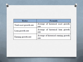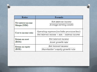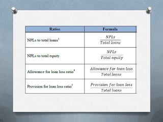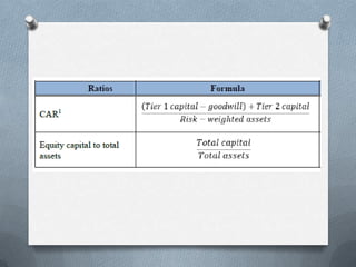 This document provides an overview of the CAMELS rating system used to evaluate the overall health and risk profile of banks. CAMELS stands for Capital adequacy, Asset quality, Management, Earnings, Liquidity, and Sensitivity to market risk. Each component is rated on a scale of 1 to 5, with 1 being the strongest. The ratings are used by regulators in the US, India, and other countries to monitor banks and determine which may require support.
