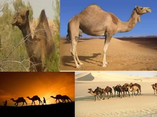 Camels have several adaptations that allow them to survive in hot, sandy desert environments. They have long eyelashes to prevent sand from entering their eyes, splayed feet that spread their weight to avoid sinking in sand, and can go up to seven days without drinking water by storing it in their stomachs. Unlike humans, camels do not need to drink hourly and can avoid sweating through their tall, thin legs which dissipate heat instead of sweating.