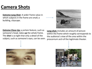 The document defines and describes various camera shots and angles used in filmmaking. It discusses extreme long shots and close-ups that show subjects from far away or in great detail. It also covers mid-range shots like medium shots that show both the subject and surroundings, as well as shot types based on the camera's position like high angles, low angles, and bird's eye or worm's eye views. The document provides filmmakers information on technical shooting styles and how different shots and angles can impact the audience's perception of the subject.