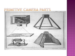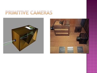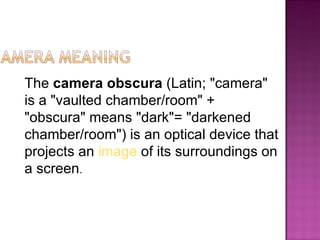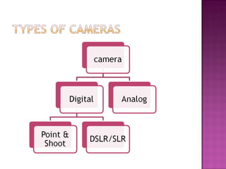 The camera obscura is an optical device that projects an external image onto a screen in a darkened space. The earliest reference to the pinhole camera, a precursor to the camera obscura, was by the Chinese philosopher Mo-Ti in 470 BCE. A digital camera records still images or video digitally using an electronic image sensor, allowing images to be immediately viewed, stored in large quantities, and deleted to save space. Point-and-shoot cameras automate all camera settings but have limited control, while DSLR cameras allow manual control and interchangeable lenses for more advanced photography. Demand for digital cameras, especially DSLRs, has grown due to technological advances, lower prices, and interest in emerging markets.