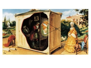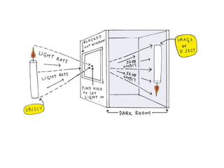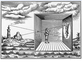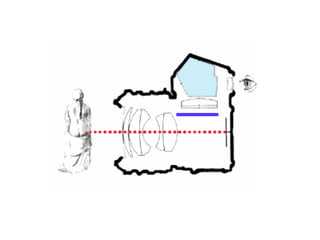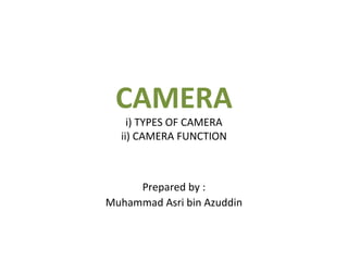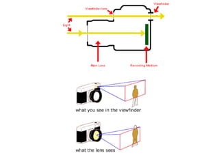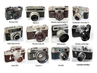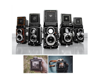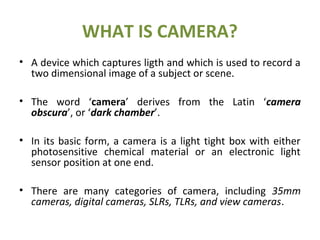 This document discusses different types of cameras. It describes five main types: pinhole cameras, view cameras, twin lens reflex cameras, rangefinder cameras, and single lens reflex cameras. Pinhole cameras have no lens and rely on a tiny hole, while view cameras consist of two boards linked by a bellows. TLRs have two identical lenses, one for viewing and one for capturing images. Rangefinder cameras use separate lenses for viewing and capturing with a focusing device. SLRs allow viewing through the capturing lens using mirrors and provide many adjustable options. Other camera types discussed include point and shoot, bridge, instant, stereo, and disposable cameras.
