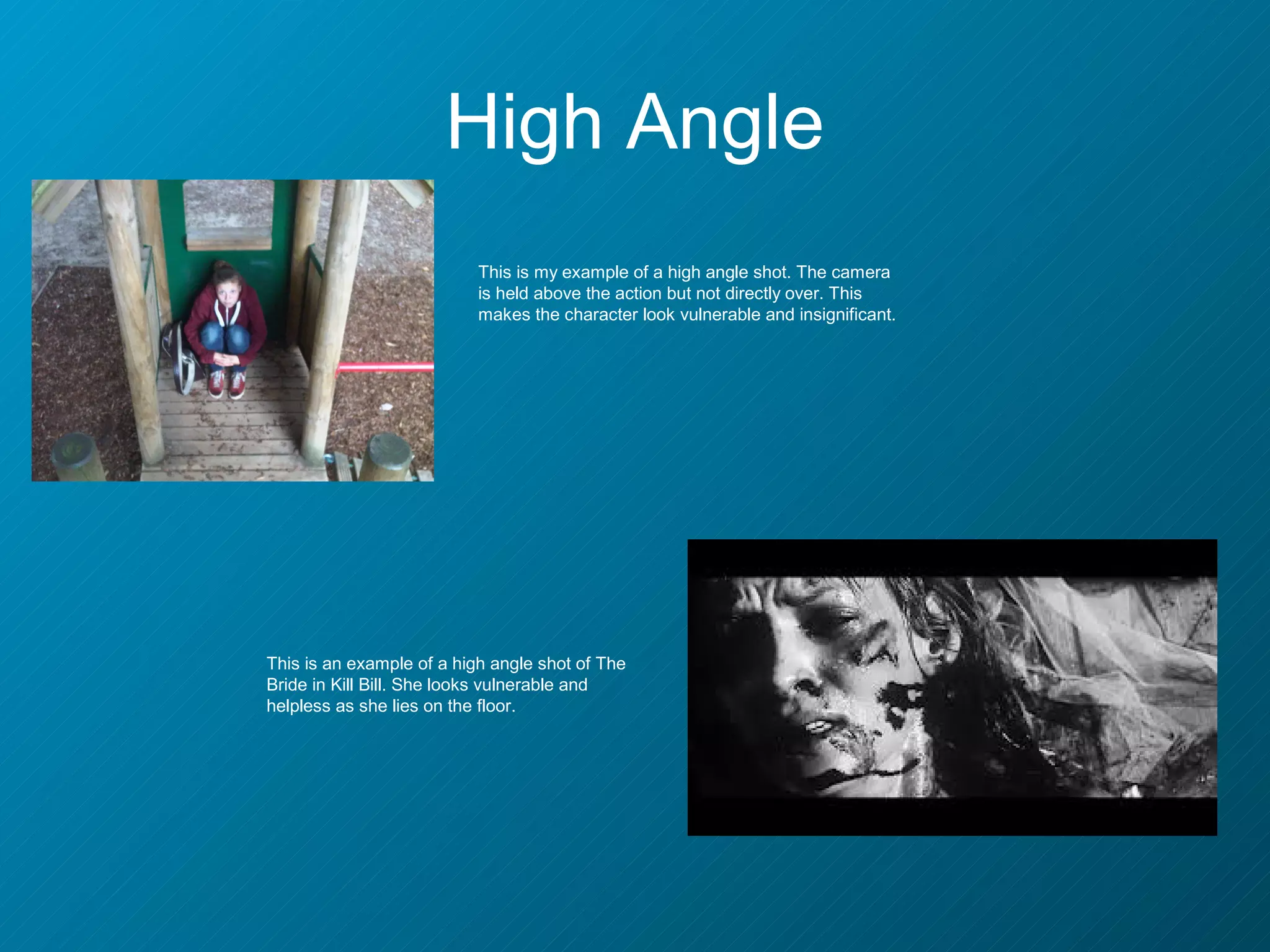 This document discusses different camera angles used in filmmaking and provides examples of each. It covers high angle shots, low angle shots, over the shoulder shots, tilt shots, long shots, medium close-ups, close-ups, extreme close-ups, bird's eye view shots, and worm's eye view shots. Each camera angle is described in terms of how it influences the audience's perception of characters and creates different emotional impacts.