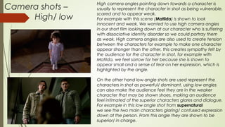 High camera angles make characters appear vulnerable while low angles make them seem powerful. Close-ups emphasize emotion and intimacy. Extreme close-ups reveal thoughts and intentions. Medium shots show body language. Over-the-shoulder shots provide point-of-view and establish relationships. Long shots set the scene and build tension. Point-of-view shots make the audience feel like they see through the character's eyes. Hand-held cameras engage the audience. Zooming and panning draw attention while tracking follows movement.
