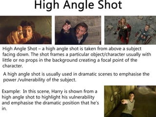 A high angle shot frames a subject from above to emphasize their vulnerability or powerlessness. A low angle shot looks up at a subject to highlight their power or strength. An establishing shot provides a wide view of a location to set the scene. Medium shots show a subject from the head to waist to convey expressions and body language. Close-ups focus on a subject's face to elicit emotions from viewers.