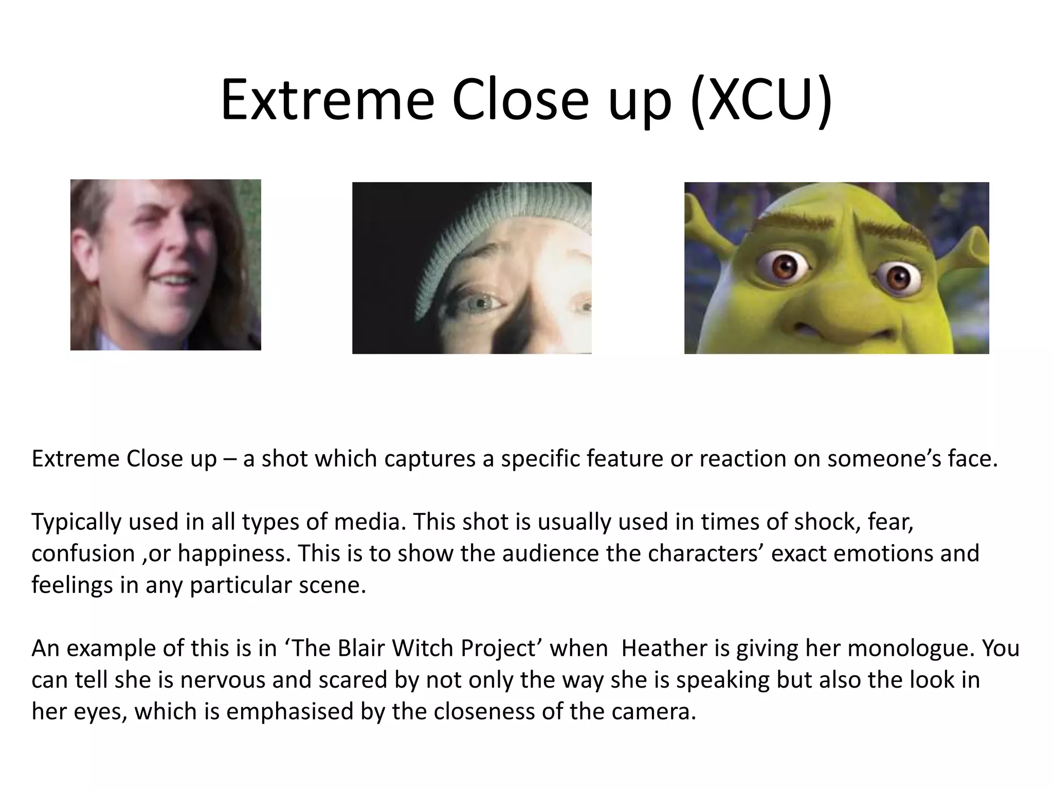 This document defines and provides examples of different camera shot types including extreme close-up, close-up, medium close-up, extreme long shot, long shot, medium long shot, mid shot, low angle, establishing shot, high angle, over the shoulder, point of view, and two shot. Each shot type is used to convey different information such as a character's emotions, setting, costumes, or interactions between characters. Examples are given from films like The Blair Witch Project, Homeland, House of Cards, Pirates of the Caribbean, and The Dark Knight.