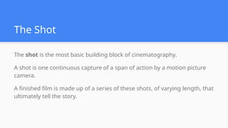 The document provides an overview of cinematography basics, emphasizing the importance of the shot as the fundamental element of film. It details various aspects of composition, including shot types and camera angles, as well as theories that guide visual storytelling. Key concepts include headroom, active space, the rule of thirds, and the use of leading lines, all contributing to effective filmmaking techniques.