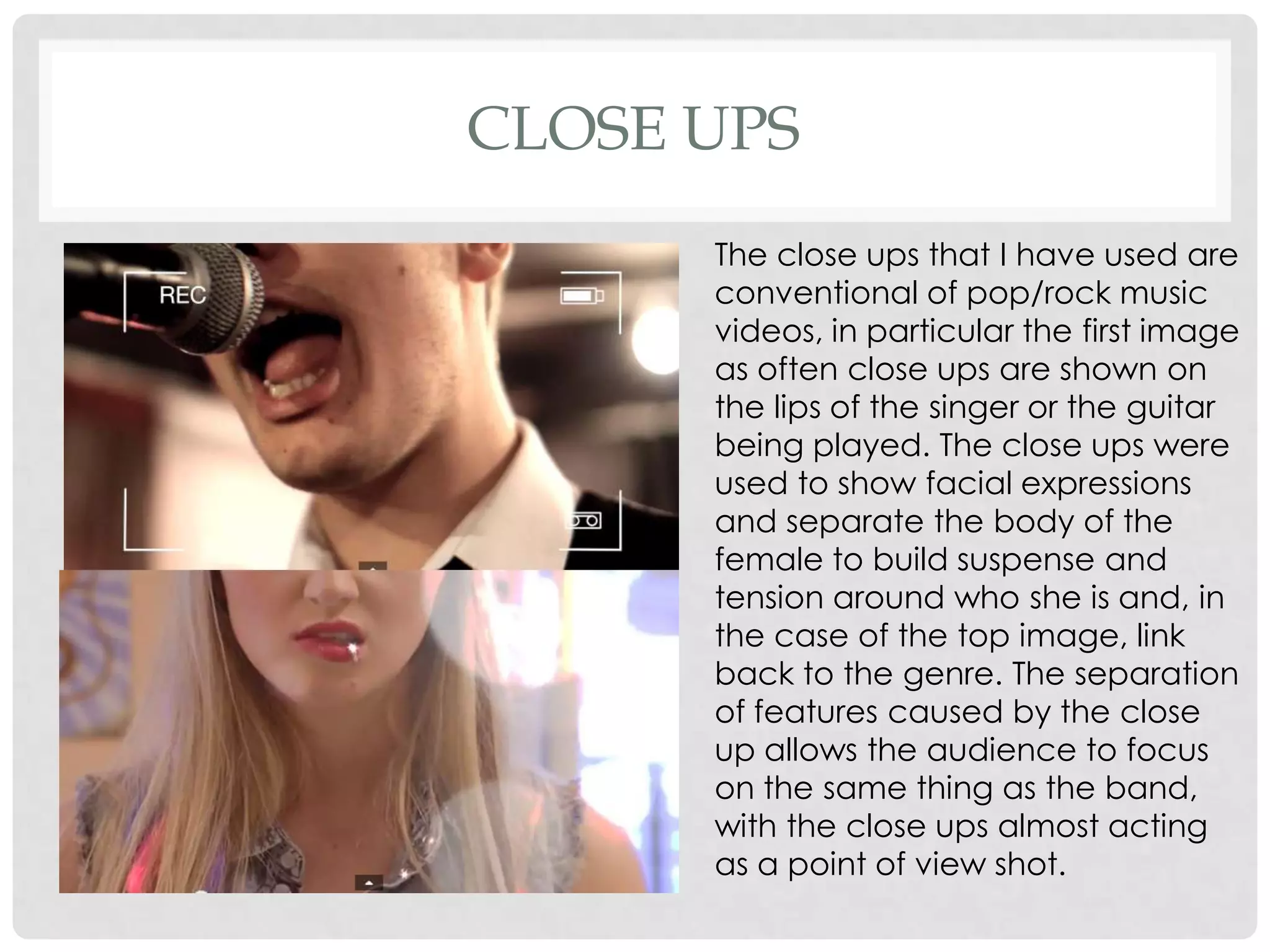 The document discusses various cinematography techniques used in the author's music video and their conventions in pop/rock music videos. It describes how close-ups were used to show facial expressions and build suspense around the female character. Extreme close-ups emphasized the band's instrumentation and transported viewers into the rehearsal room. Wide shots showed the band playing as a unit and allowed viewers to see character interactions. A high angle shot provided a different perspective and suggested viewers were "looking down" at the characters' actions. Two shots established character relationships, and pans and quick editing kept the video energized and matched the song's pacing.