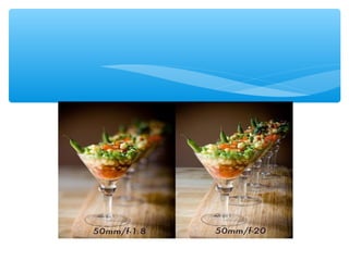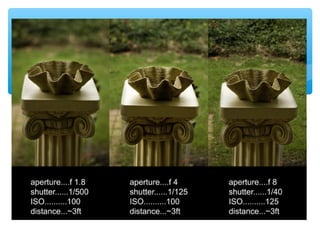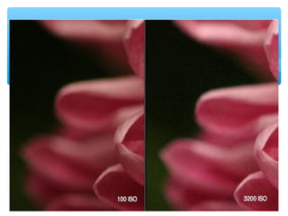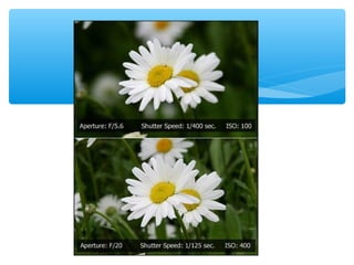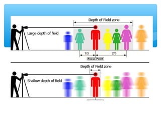 This document provides an overview of different types of cameras and their functions. It discusses Single Lens Reflex (SLR) cameras and their viewfinders. It then covers various camera modes including Program, Shutter Priority, Aperture Priority, Manual, Portrait, Landscape, Macro, Sports, Night Portrait, and Flash. Each mode is described in 1-2 sentences. It also discusses the exposure triangle of aperture, shutter speed, and ISO settings and how they work together to control light exposure. Aperture size, shutter speed times, and ISO numbers are defined. The document aims to educate readers on the basic functions and settings of digital cameras.