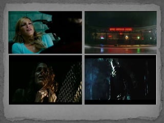 The document discusses common camera techniques used in slasher film posters, trailers, and films. It notes that low angle shots are typically used to emphasize the antagonist, making them appear threatening. In contrast, high angle shots are used for victims to portray them as weak. Wide shots and pans are used to establish isolated settings. The document then discusses how the filmmaker will apply these techniques in their own slasher film trailer and posters, including using low and high angles, long shots, and close-ups to portray characters and generate fear.