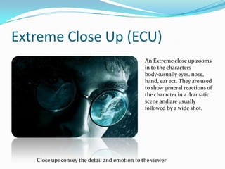 The document discusses different types of camera shots including extreme close ups, close ups, medium shots, long shots, panoramic shots, and bird's eye views. Extreme close ups focus on small details like eyes or hands to show character reactions. Close ups contain the face and shoulders and are used to convey emotion. Medium shots capture characters from the waist up to set the scene. Long shots show characters from head to toe, often at the beginning of scenes. Panoramic shots provide a wide view of everything happening. Bird's eye views provide an overview of the location, time period, and things characters cannot see themselves.