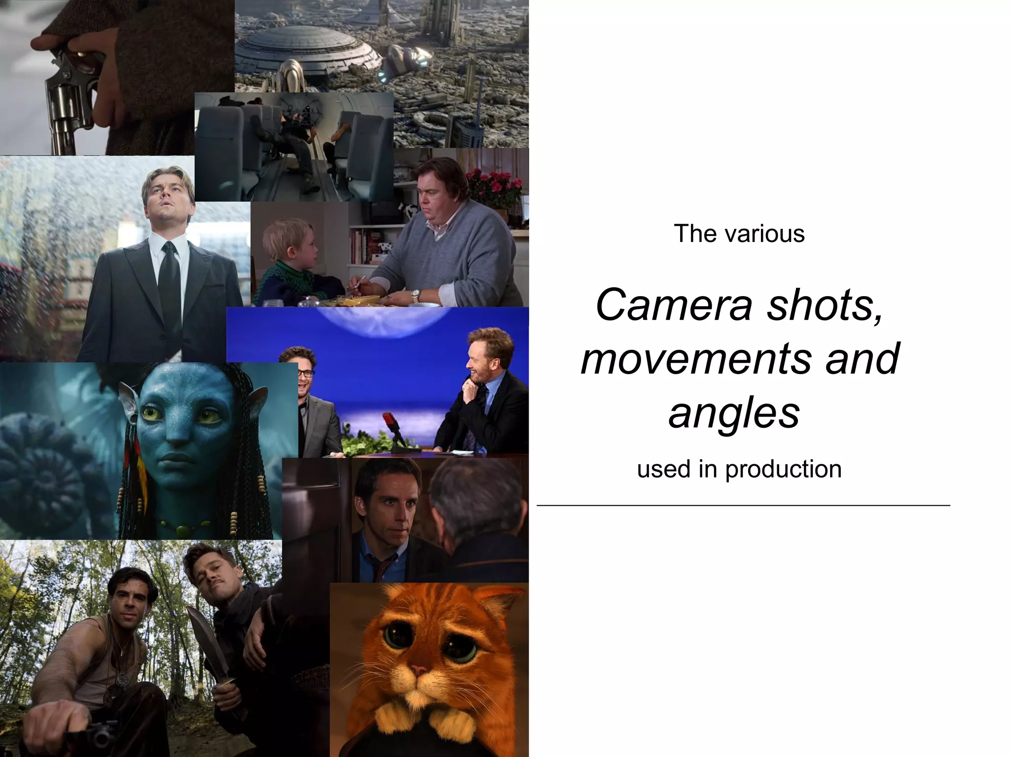 The document outlines various camera shots, movements, and angles used in film production, including establishing shots, long shots, mid shots, and close-ups, each serving different narrative functions. It discusses how these shots engage the audience emotionally and provide context, emphasizing techniques like high angle, low angle, and tracking shots. Additionally, it explains the impact of camera movements such as panning and crane shots in conveying progression and perspective within scenes.
