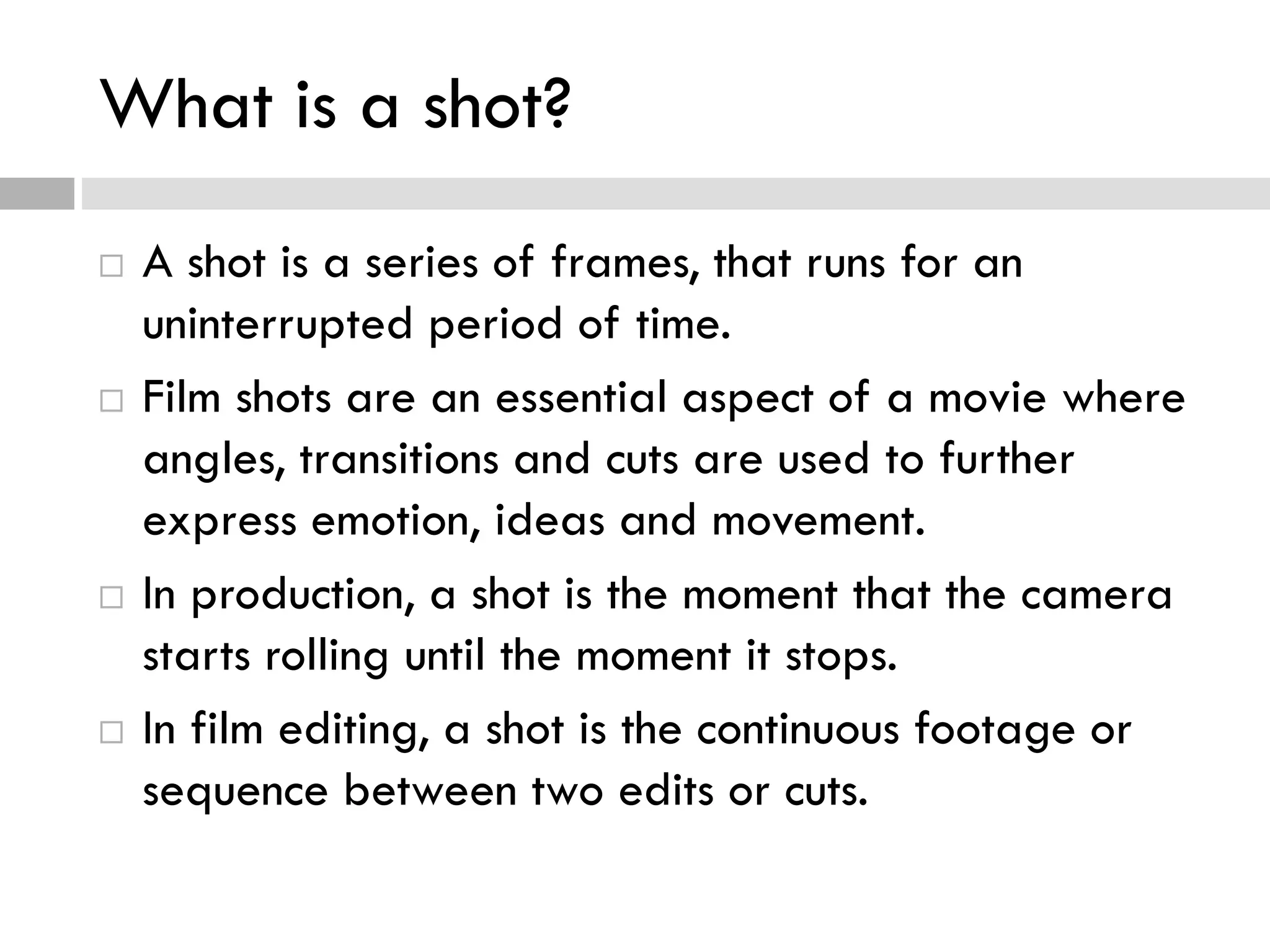 A shot is a series of frames recorded during an uninterrupted period of filming. There are various types of shots defined by their camera distance, angle, and movement. Shots can be categorized as extreme long shots, long shots, mid shots, close-ups, point-of-view shots, and more. Camera angles are also used to convey meaning, such as high angles conveying inferiority and low angles conveying superiority. Camera movement techniques include panning for horizontal rotation, tilting for vertical rotation, zooming, and tracking with a dolly.