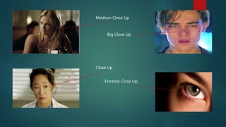 - Extreme close-ups, close-ups, medium shots, long shots, and aerial shots from high, eye-level, and low angles.