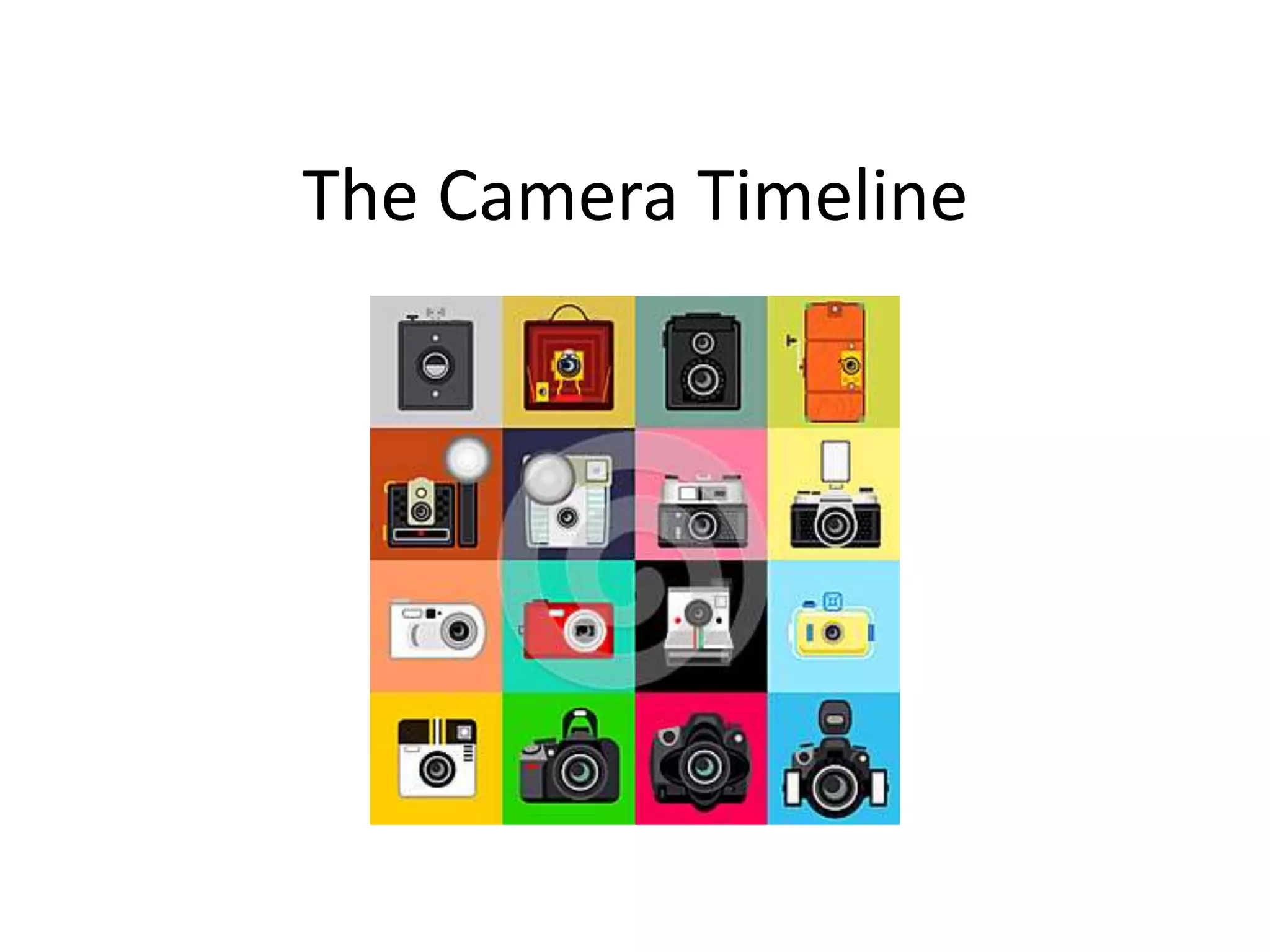 The document outlines the history and development of cameras from 1727 to present day. It describes several key innovations including Johann Heinrich Schulze discovering in 1727 that silver nitrate could capture images when exposed to light, paving the way for the first photographs. In 1837, Louis Daguerre invented the Daguerreotype process which reduced exposure time and prevented images from fading. George Eastman later invented the first roll-film camera in 1888, making picture taking more convenient. Edwin H. Land further developed instant photography with his Polaroid camera in 1948, allowing photos to develop immediately. Digital cameras were invented in the 1970s and became widely available to consumers in the 1980s and 1990s, changing how photos were