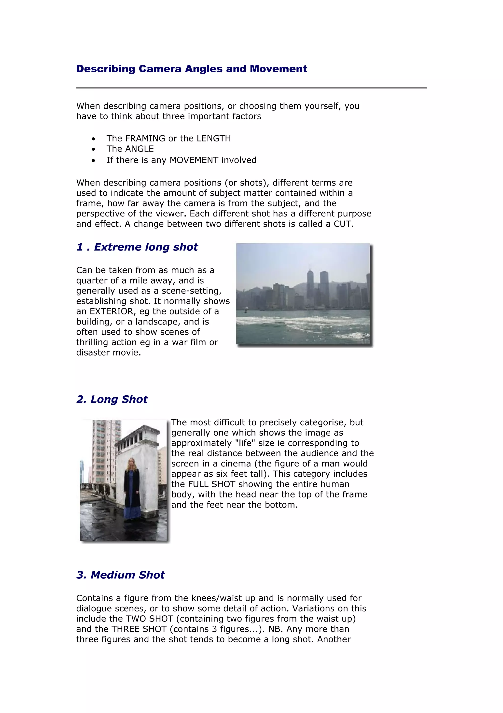 The document describes different camera angles, shots, and movements that are used in filmmaking. It discusses the factors of framing/length, angle, and movement when describing camera positions. It then provides definitions and examples of different shots including extreme long shots, long shots, medium shots, close-ups, and extreme close-ups. It also discusses different camera angles like bird's-eye view, high angle, eye level, low angle, and oblique/canted angle. Finally, it outlines different types of camera movements such as pans, tilts, dolly shots, hand-held shots, crane shots, zoom lenses, and aerial shots.