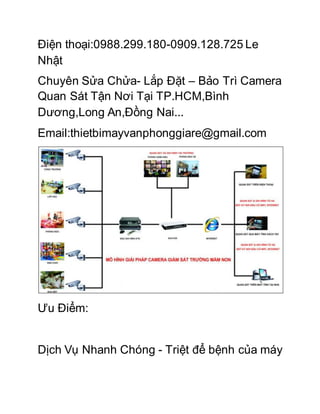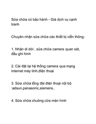 Dịch vụ sửa chữa và bảo trì camera quan sát, thiết bị viễn thông và các thiết bị văn phòng tại TP.HCM và các tỉnh lân cận. Công ty cung cấp dịch vụ nhanh chóng, bảo hành và giá cả cạnh tranh, bao gồm sửa chữa tổng đài điện thoại, máy tính, hệ thống báo động, và lắp đặt camera. Khách hàng có thể liên hệ qua số điện thoại hoặc email để được hỗ trợ.