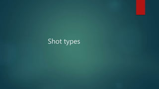 This document discusses various camera shots and techniques used in filmmaking, including: long shots, medium shots, and close-ups to frame subjects from different distances. It also covers point-of-view shots, extreme wide and close-up shots, over-the-shoulder shots, and camera angles like high, low, and canted. Additionally, it outlines different types of camera movement such as pans, tracking shots, and aerial shots. The purpose is to convey information and emotion through strategic camera placement and motion.