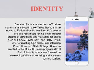 Cameron Anderson was born in California and lived in Nevada until moving to Florida at age 4. He has been a lifelong fan of pop and rock music. After graduating high school and attending community college, he enrolled in the Music Business program at Full Sail University to focus on advertising and marketing, with the goal of working for a major record label like Universal Music Group. His personal brand focuses on building relationships through a shared passion for music and helping artists further their creative visions.