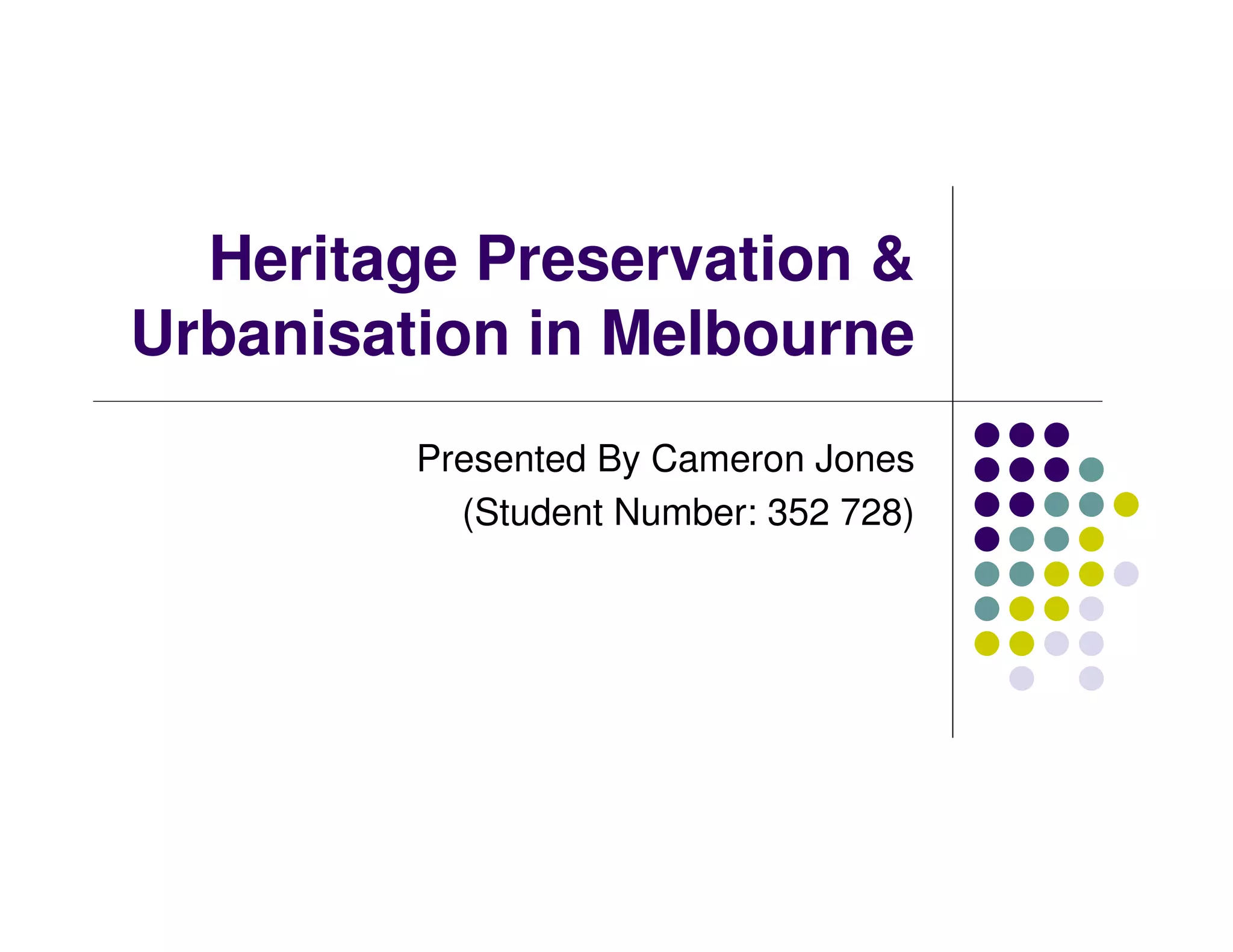 The document discusses the conflict between heritage preservation and urbanization in Melbourne. It presents two perspectives on the issue - an economic perspective and a cultural perspective. It also examines current planning policies like Melbourne 2030 that aim to balance heritage and growth. The document reviews arguments that heritage preservation provides cultural identity and economic benefits through tourism and employment. However, urbanization raises issues around affordable housing and stress on infrastructure. The document considers if heritage preservation and urban growth can be balanced or if protections need to be relaxed in some areas to allow for more development.