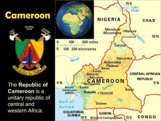 The Republic of Cameroon is a bilingual country located in central Africa. It was formed by the unification of former British and French territories. There is growing tension between English and French speakers and the government. Cameroon has diverse geography and climate zones due to its location along the Cameroon Volcanic Line, which includes active volcanoes like Mount Cameroon. Natural disasters like gas eruptions from lakes have killed thousands in Cameroon in the past. Deforestation is also a major issue affecting the country's environment.