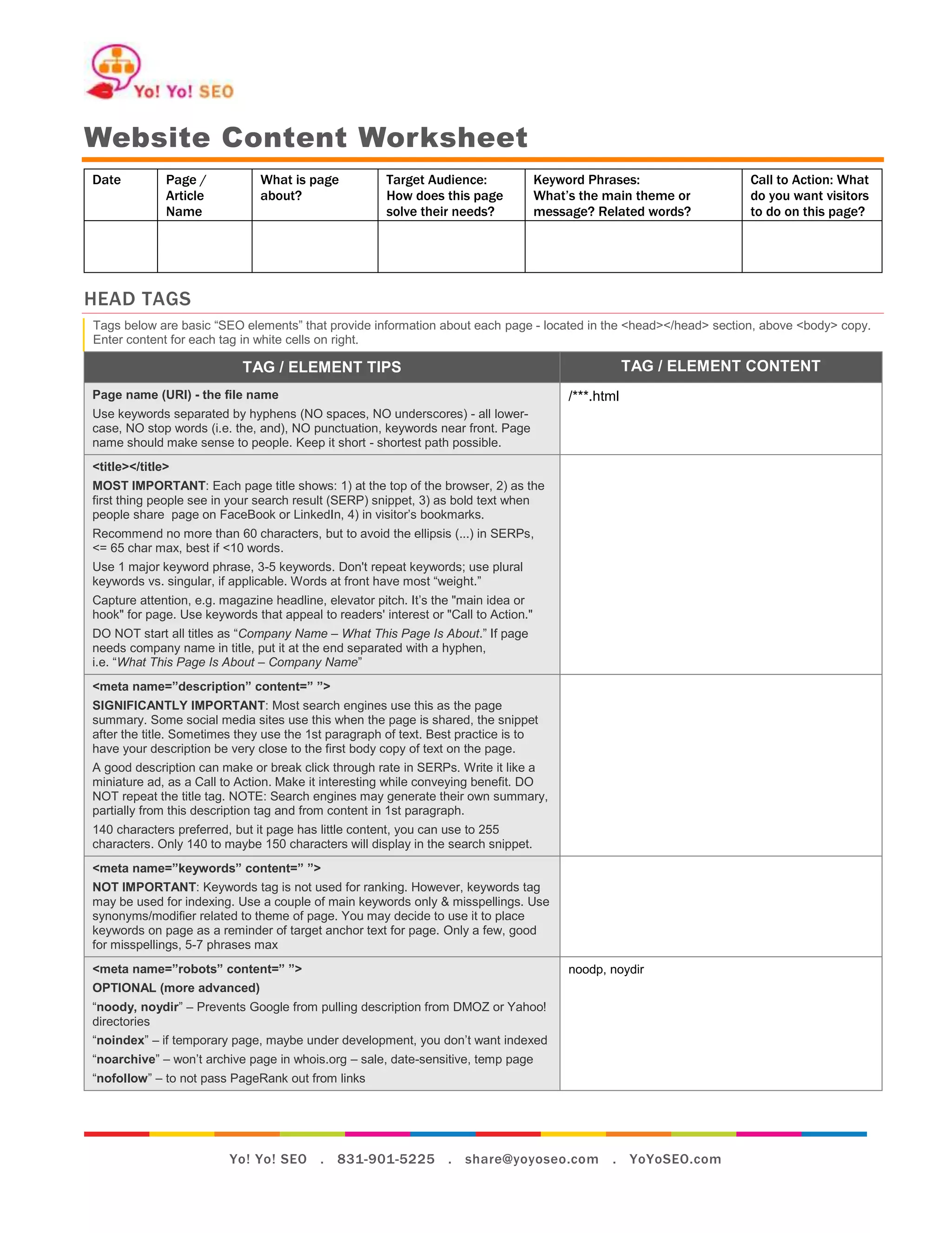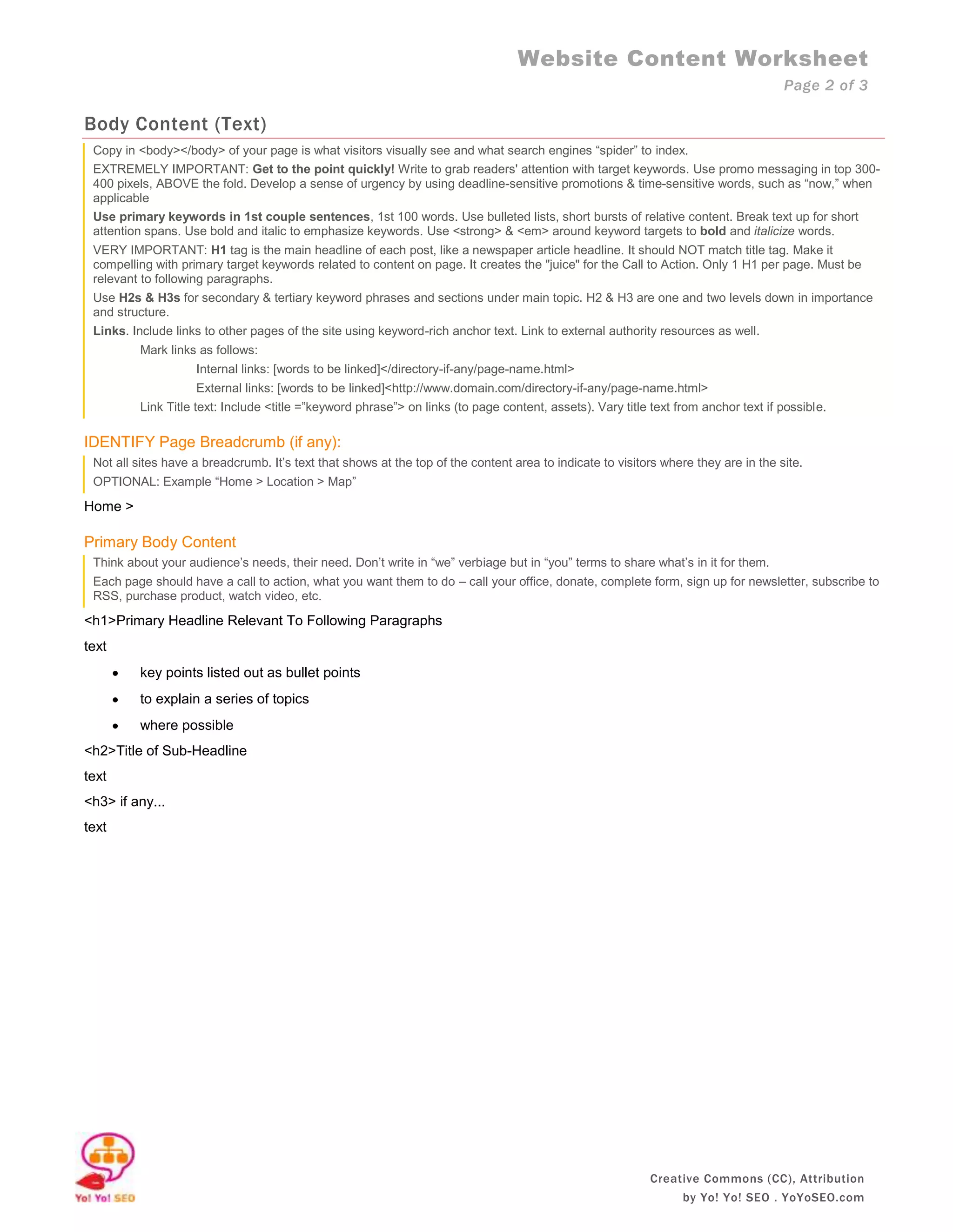 This document provides a template for optimizing website content for search engines. It includes sections for inputting metadata like the page title, description, and keywords. The body content section emphasizes using target keywords, headings, links, and other formatting to clearly convey information to visitors. Images, videos and other page assets should also be optimized with descriptive filenames, alt text and captions. Calls to action are recommended to encourage behaviors like contacting the business or subscribing.