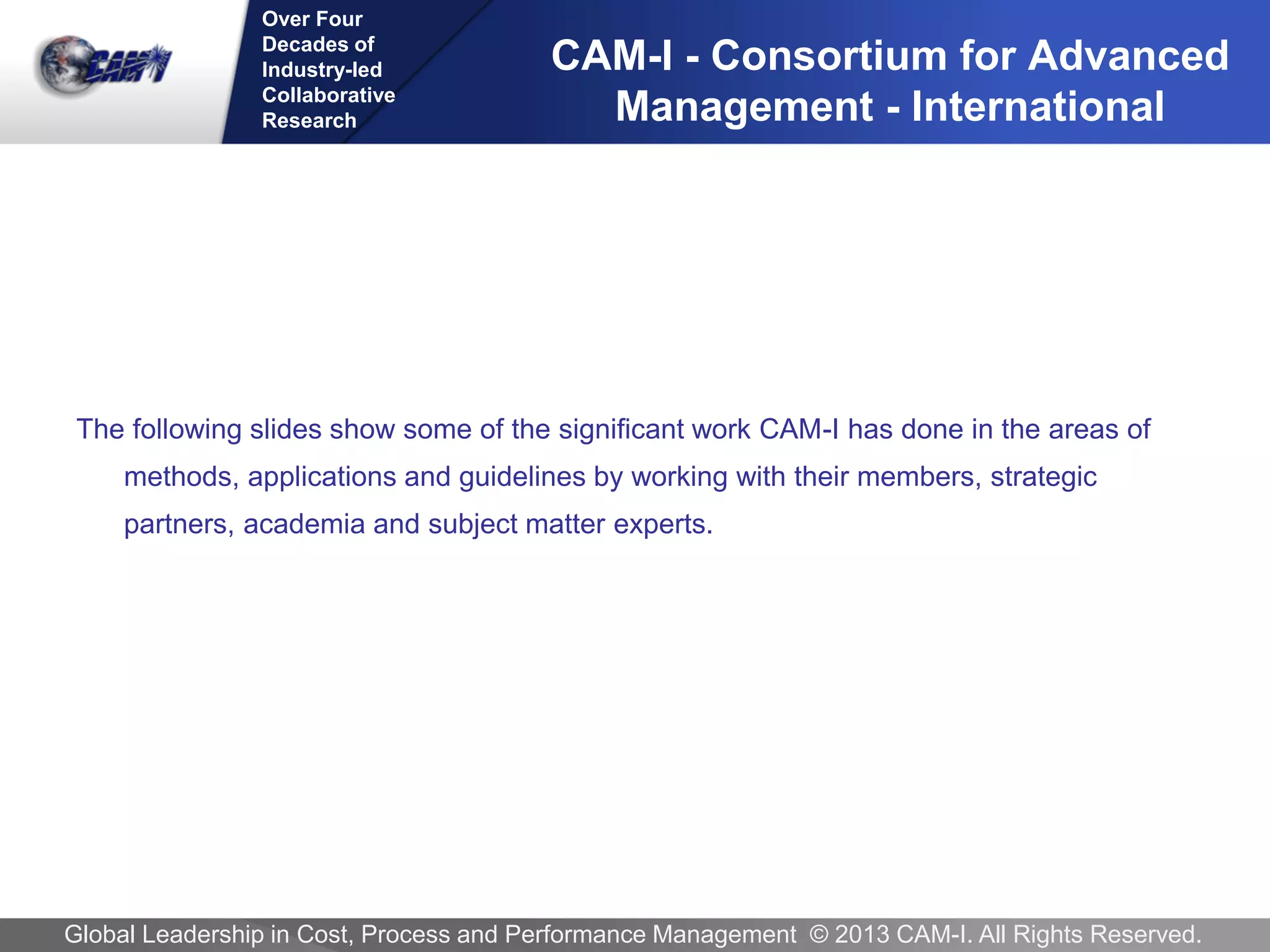 The document outlines CAM-I's extensive work over four decades in cost, process, and performance management through collaborative research with various stakeholders. It highlights methodologies such as activity-based costing, target costing, and a performance management framework designed to optimize organizational efficiency and decision-making. CAM-I's models and frameworks have been adopted by major corporations to improve cost management and operational planning.