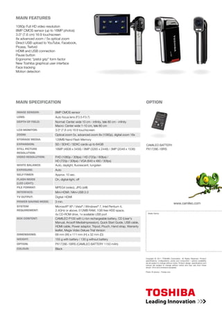 The document describes a digital camcorder that captures Full HD video. It has an 8x advanced zoom, 3-inch touchscreen, and ability to instantly share videos online with one click. The camcorder has a pistol grip form factor, records 1080p video, and allows pausing while recording within the same clip.
