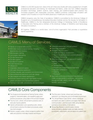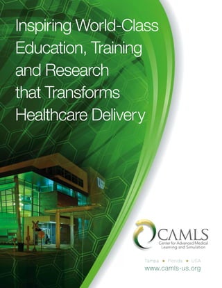 CAMLS is a 90,000 square foot facility located in Tampa, Florida that provides world-class healthcare education, training, and research. It integrates simulation technology, team training, and evidence-based practices into innovative programs. CAMLS offers a variety of services including surgical skills labs, minimally invasive training, research and innovation centers. It is accredited by several medical organizations and aims to improve healthcare delivery through inspiring education and cutting-edge innovation.