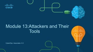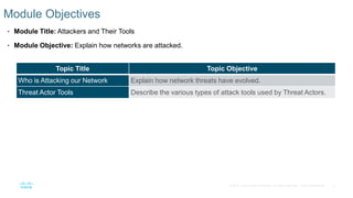 The document discusses attackers and their tools. It defines key cybersecurity terms like threats, vulnerabilities, risks and explains how risks are managed. It describes different types of attackers like hackers, cybercriminals and state-sponsored actors. It also discusses the tools used by attackers, how they have evolved over time, and categories of common network attacks. The goal is to understand the landscape of attackers and tools in order to better defend networks and assets.