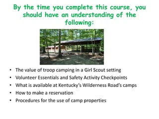 The document provides information for volunteers on camping procedures and guidelines for Girl Scout troops. It discusses the value of camping, safety resources like Volunteer Essentials and Safety Activity Checkpoints, reserving campsites, supervision requirements, health forms, activities at the four camps, site managers, safety procedures including fire, first aid and medications, prohibited items, and preparing for camp. The overall document aims to prepare volunteers to lead safe and enjoyable camping trips for Girl Scout troops.