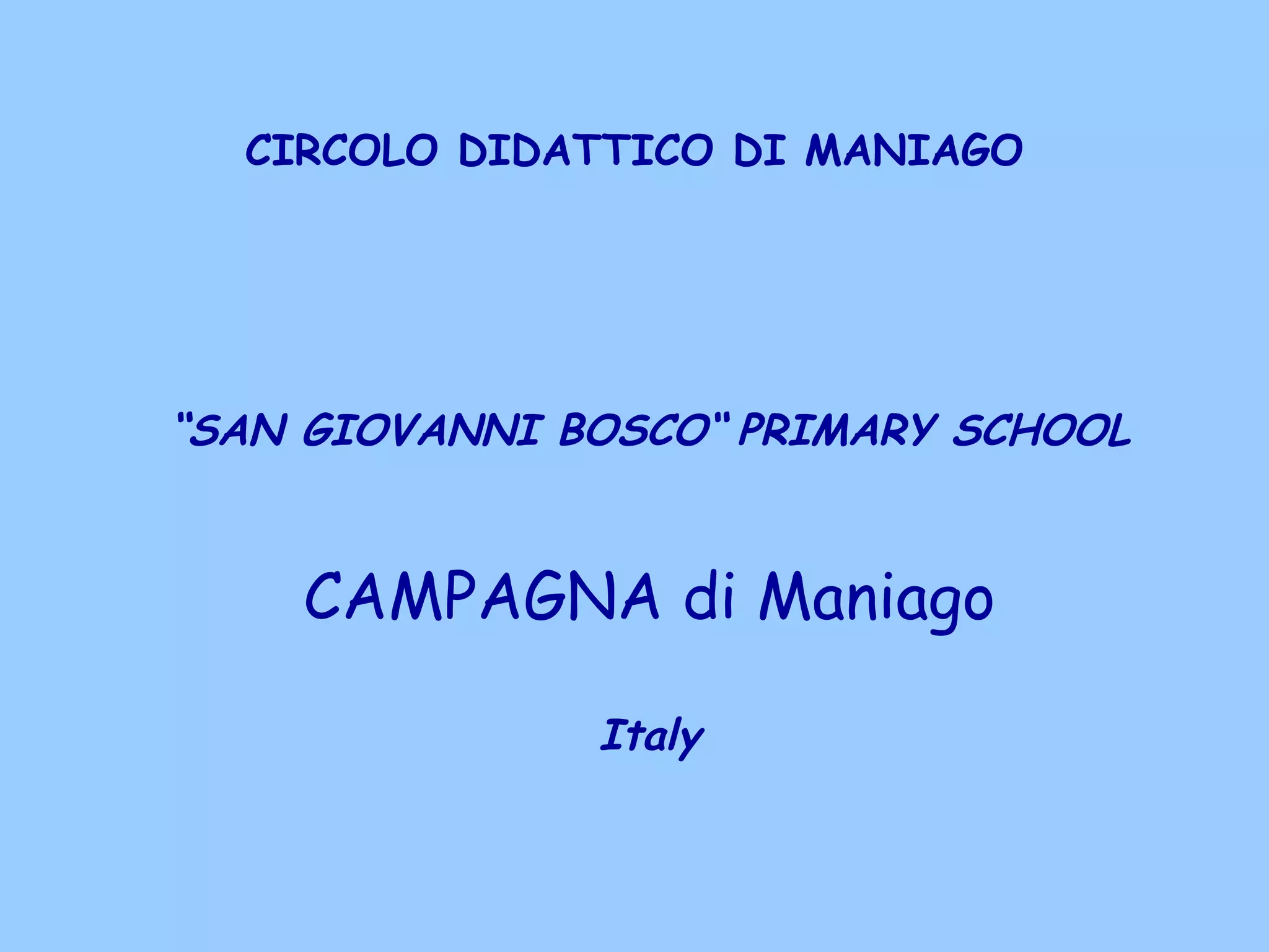 This document provides information about the Circolo Didattico di Maniago "San Giovanni Bosco" primary school in Maniago, Italy. It details that the school has over 1000 students and 100 teachers across 5 primary schools. It then introduces the Campagna "San Giovanni Bosco" primary school specifically, noting it has 91 students across 5 classes and is located in Campagna, Italy. Finally, it provides short introductions and backgrounds of students from years 4 and 5 of the Campagna school.